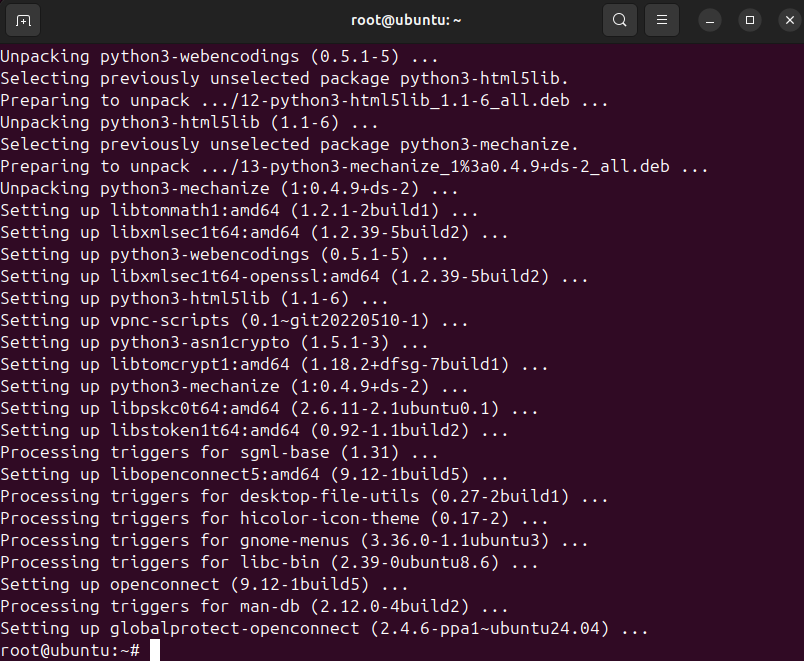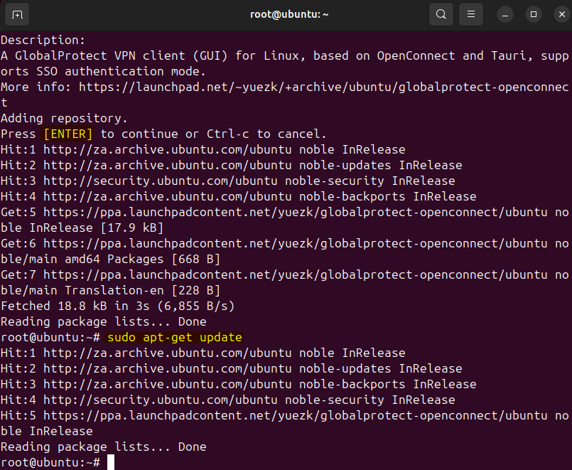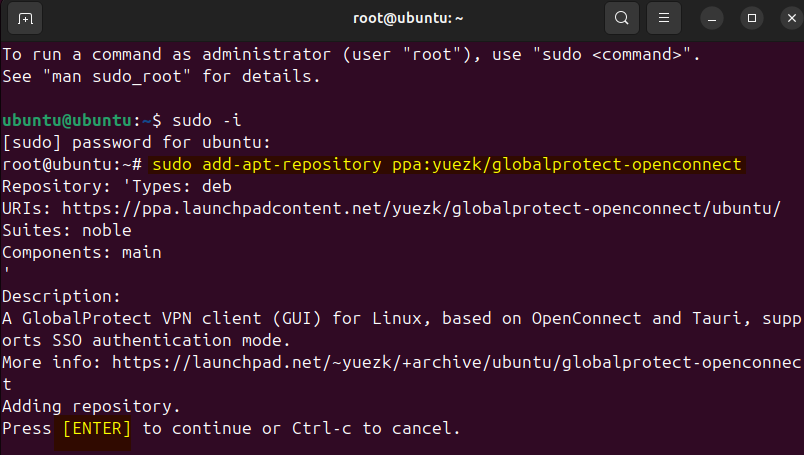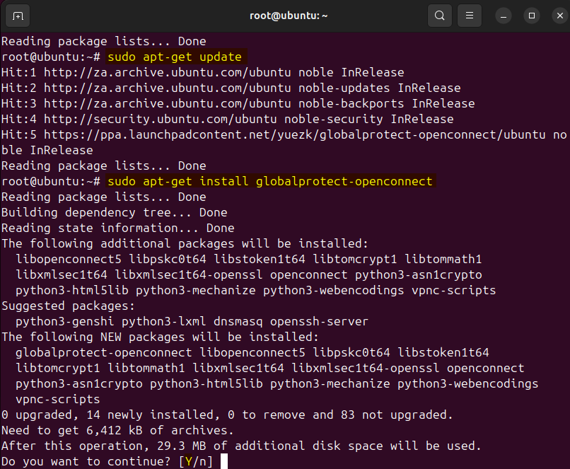 sudo apt-get install globalprotect-openconnect. Press Enter to continue.