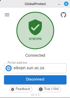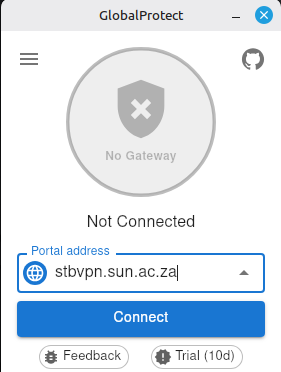 6. Upon launching the Global Protect app, please enter the following portal address: stbvpn.sun.ac.za. Click “Connect” to continue.
